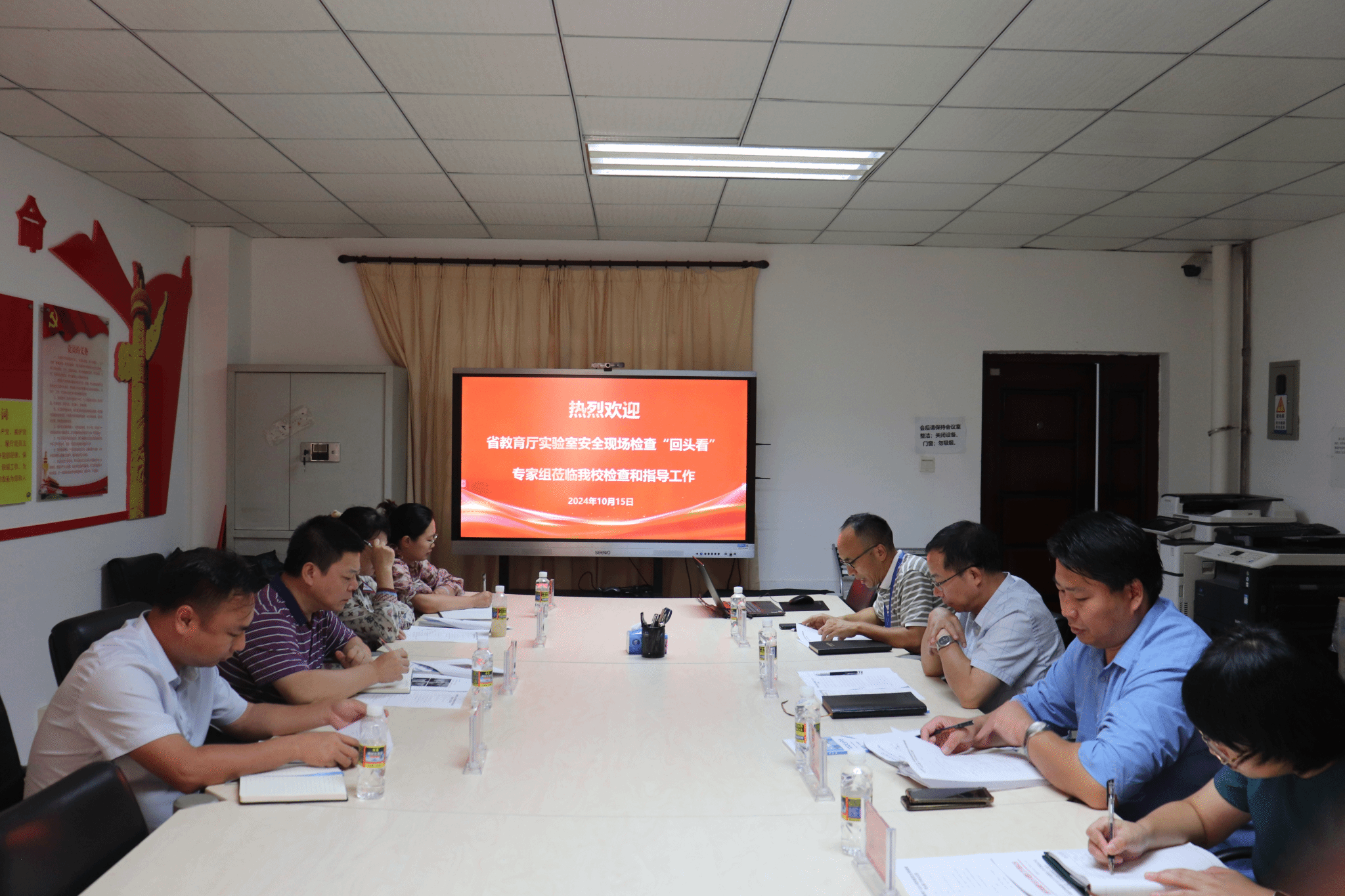 10月15日下午,由省教育厅高教处一级调研员刘世琼带队,高校实验室安全检查专家组一行4人莅临我校开展2024年度实验室安全现场检查“回头看”工作。检查工作会议在行政楼209会议室召开,校党委常委、副校长李步洪出席。实验室与设备管理处副处长(主持工作)冯建成主持会议。