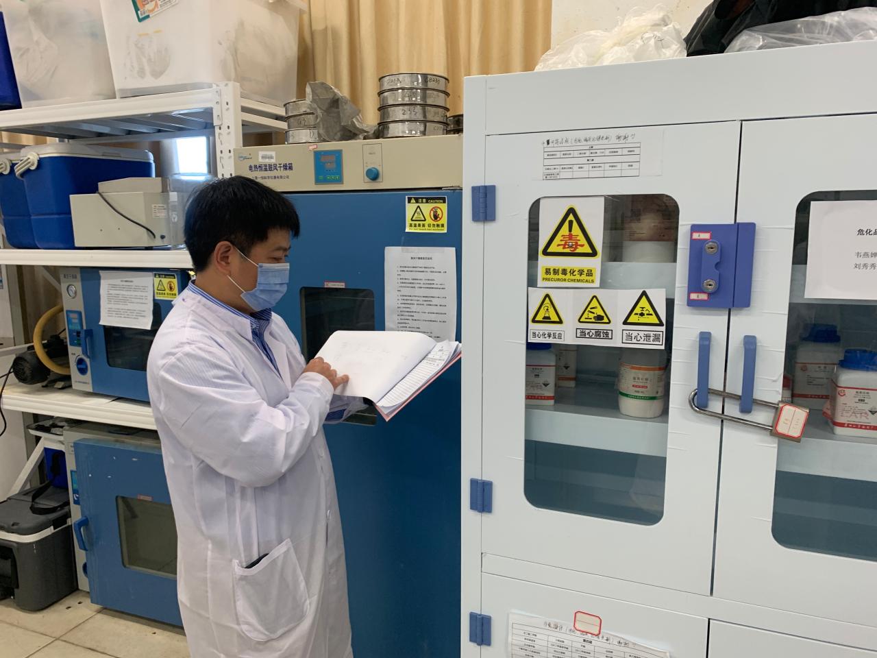 吴祝武在实验室与设备管理处黄绵佳处长陪同下,检查了李运强楼实验室和南海海洋资源利用国家重点实验室。在检查现场,吴祝武以教育部实验室技术安全检查的标准认真查看了实验室 的每一个角落,对院级单位在实验室安全管理和建设上所做得的工作给与了充分的肯定,也指出了个别实验室存在的安全隐患及不足并明确了整改要求。吴祝武强调实验室化学品必须要分类存放,注意储存禁忌。存放化学品的柜子必须是专用的化学品柜,每个化学品柜有存放化学品的明细表和领用记录。实验室气瓶必须要固定,有毒有害气体要存放至带有报警、排风装置的安全防爆柜里,同时在气瓶上要有使用状态标识。