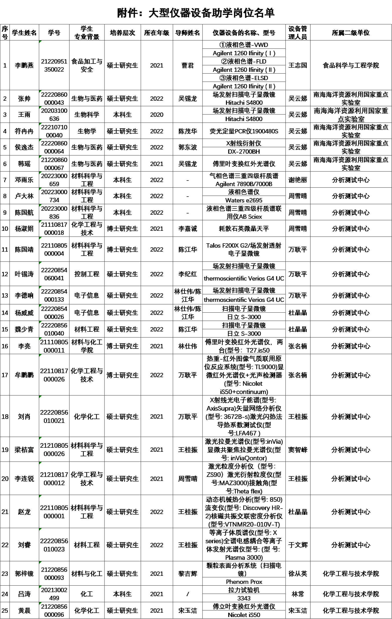 根据《大型仪器设备助学岗位招聘公告》(海大实〔2023〕19号)文件,设立大型仪器设备助学岗位,以大型仪器设备近三年的共享效益为主要依据,审批通过25位应聘学生的申请。